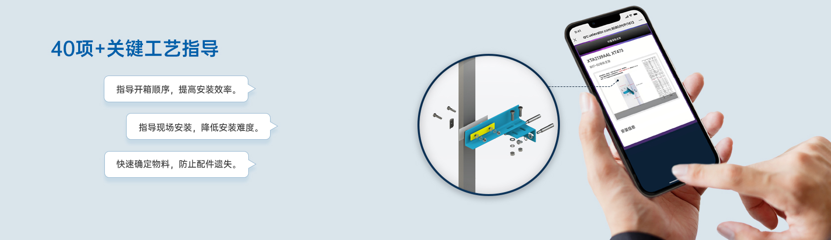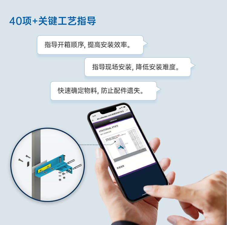 西子電梯擁有快捷的工藝指導系統,掃碼即可查看安裝方法,提升安裝效率與安裝質量。